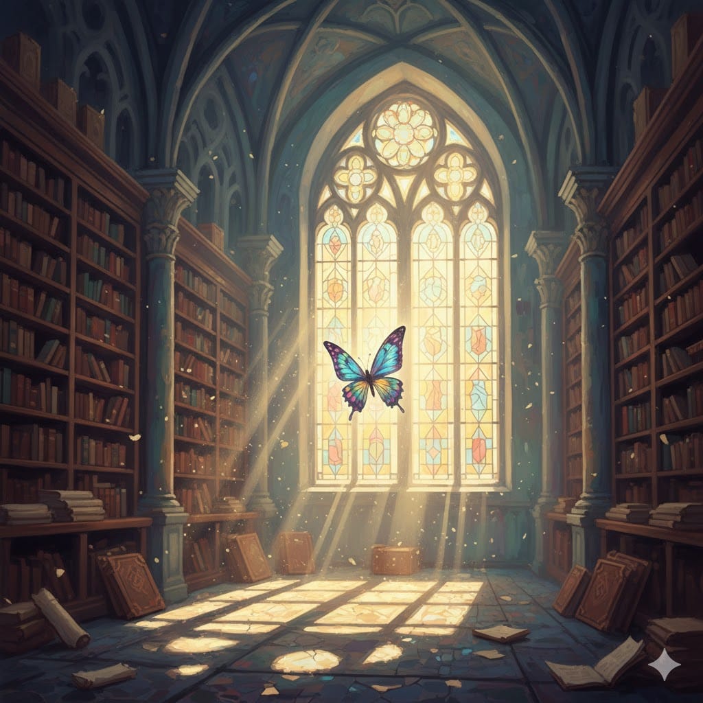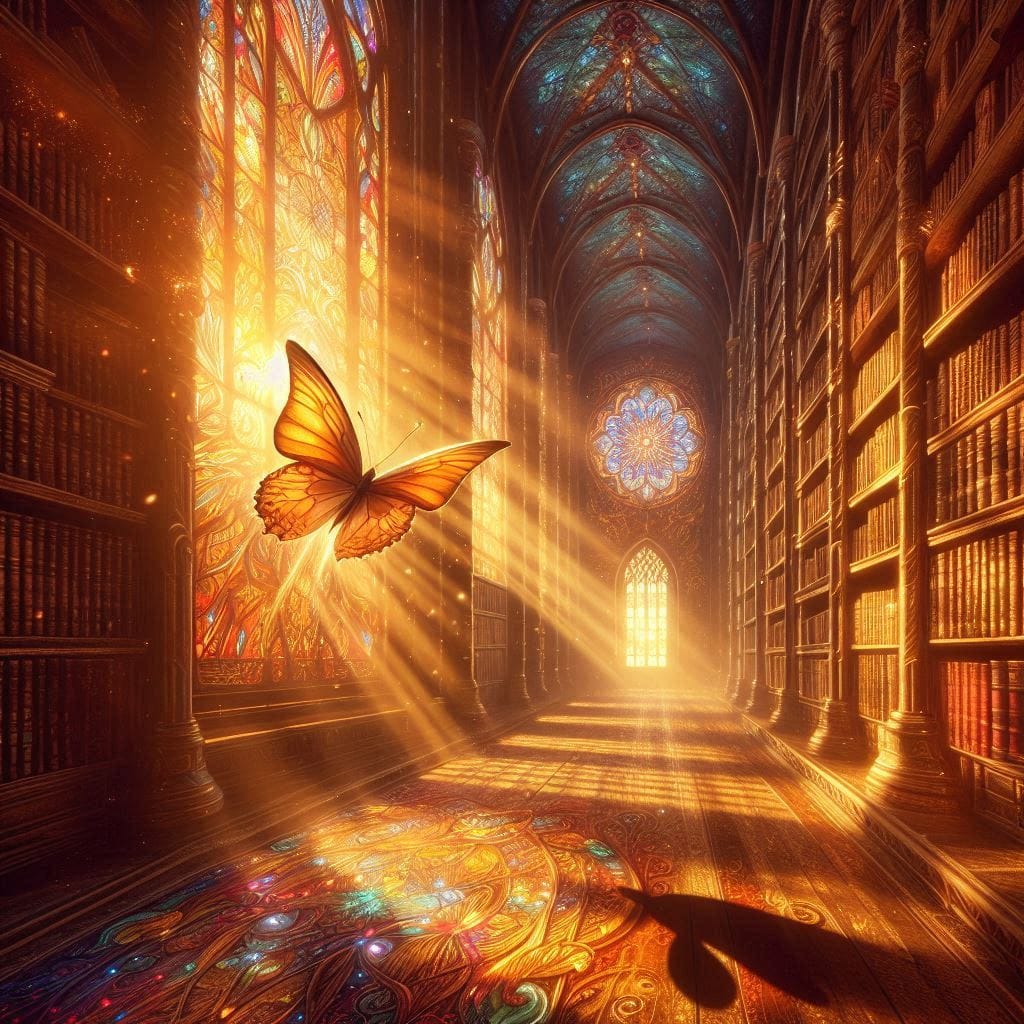 Same Prompt🤔: Create an inspiring image of a single butterfly flying in an ancient library with sunrise coming through a large stained glassed window in the style of a fantasy impressionist painting using stark shadows and a dreamy color palette.