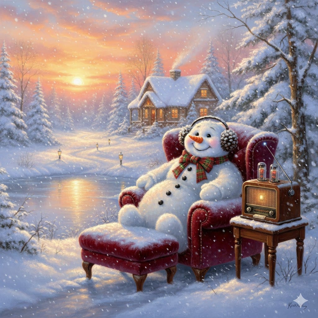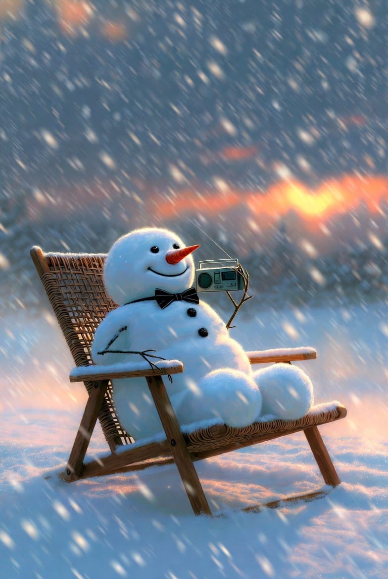 Same Prompt🤔: Create an image of snowman wearing a bowtie sitting in a lounge chair listening to a radio outside during a snowstorm watching the sunrise in the style of a Kinkade painting.