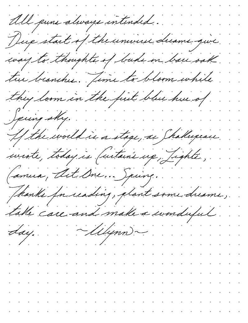 Deep start of the universe dreams give way to thoughts of buds on bare oak tree branches. Time to bloom while they loom in the first blue hue of Spring's sky.