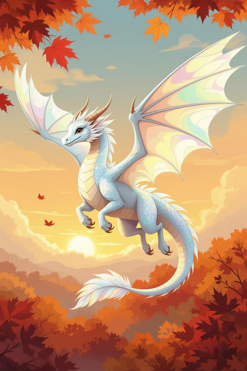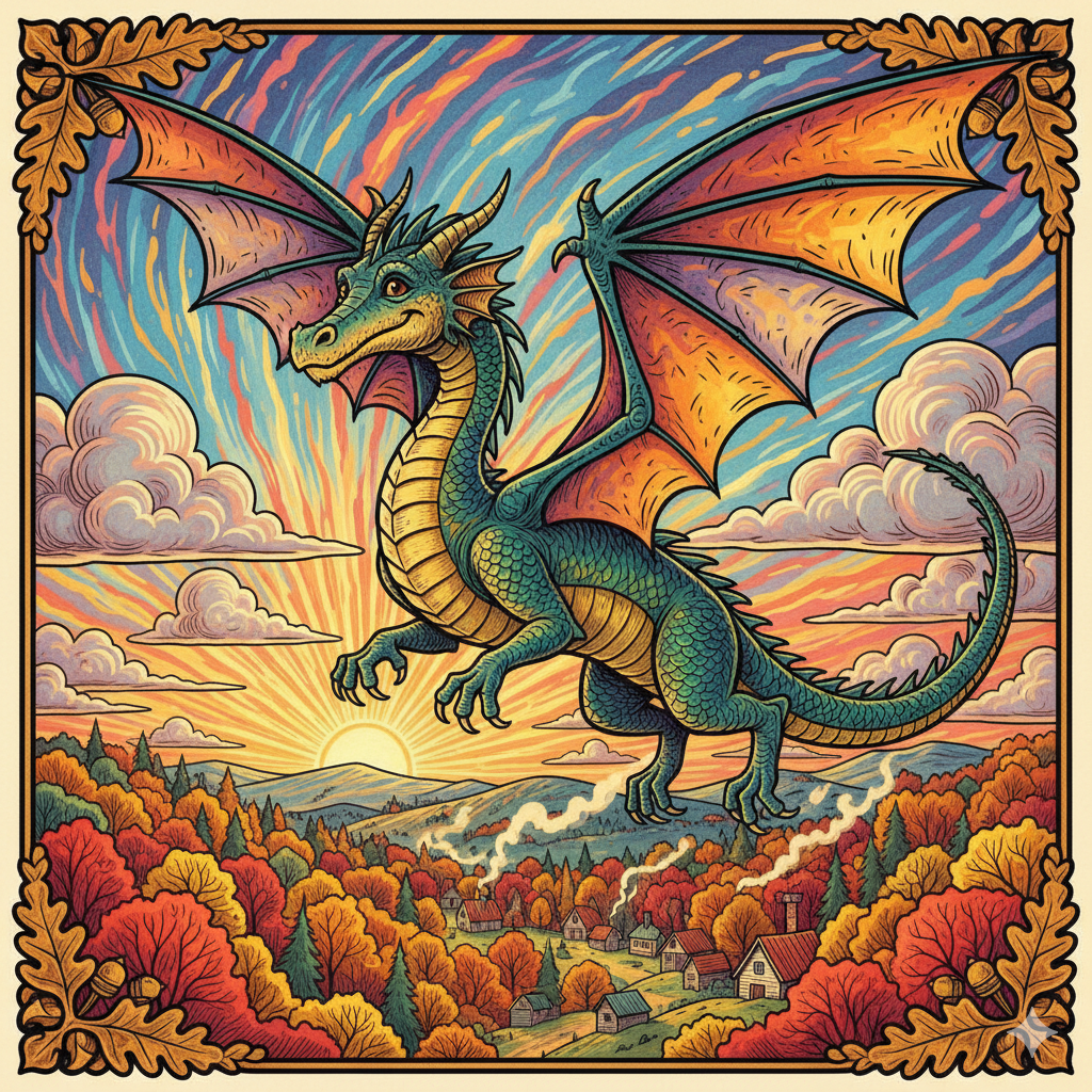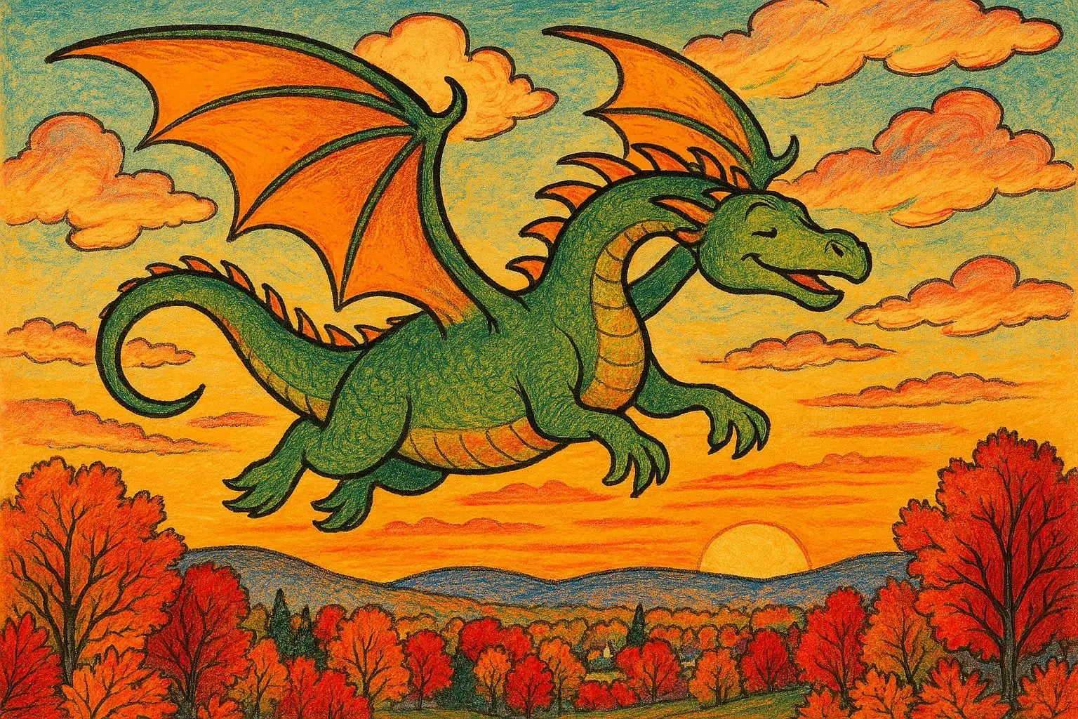 Promptly Spoke: Create an image of a beautiful vintage storybook illustration of a joyful peaceful dragon flying through a colorful Autumn sky at dawn in New England using vibrant colors and bold contour lines.