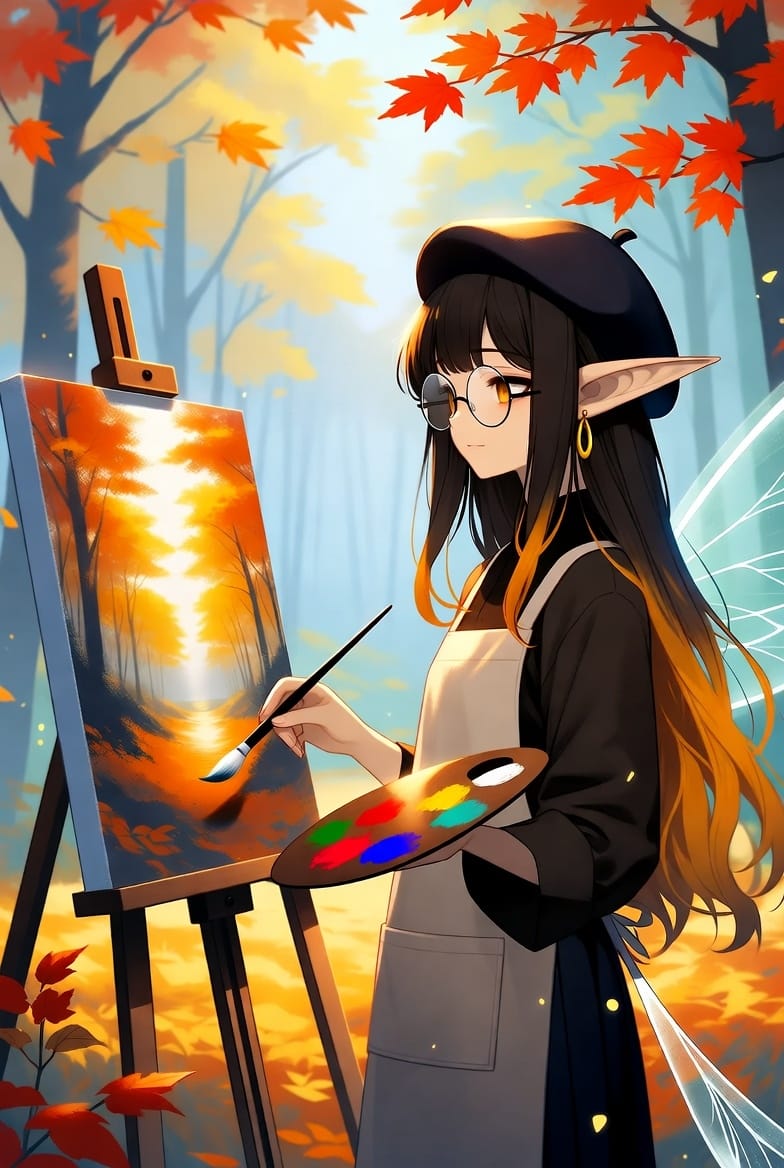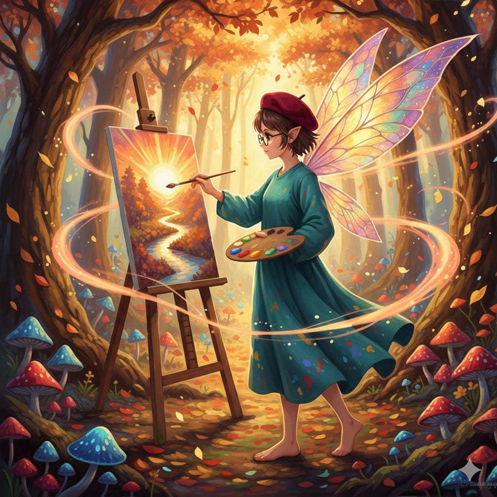 Same Prompt 🤔: Create an image of a faerie wearing a beret, glasses, and an artist's smock painting a picture of the sunrise in Autumn standing in an enchanted forest in the style of a magical impressionist anime painting.