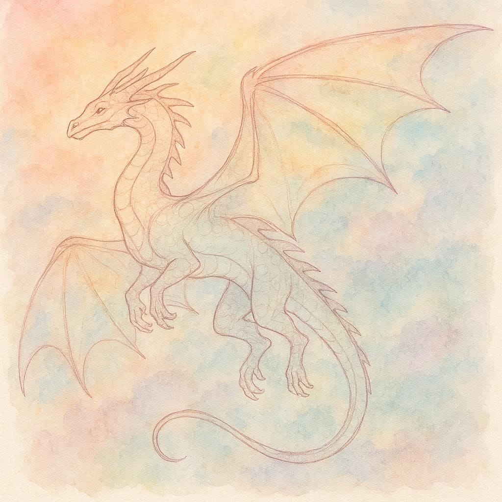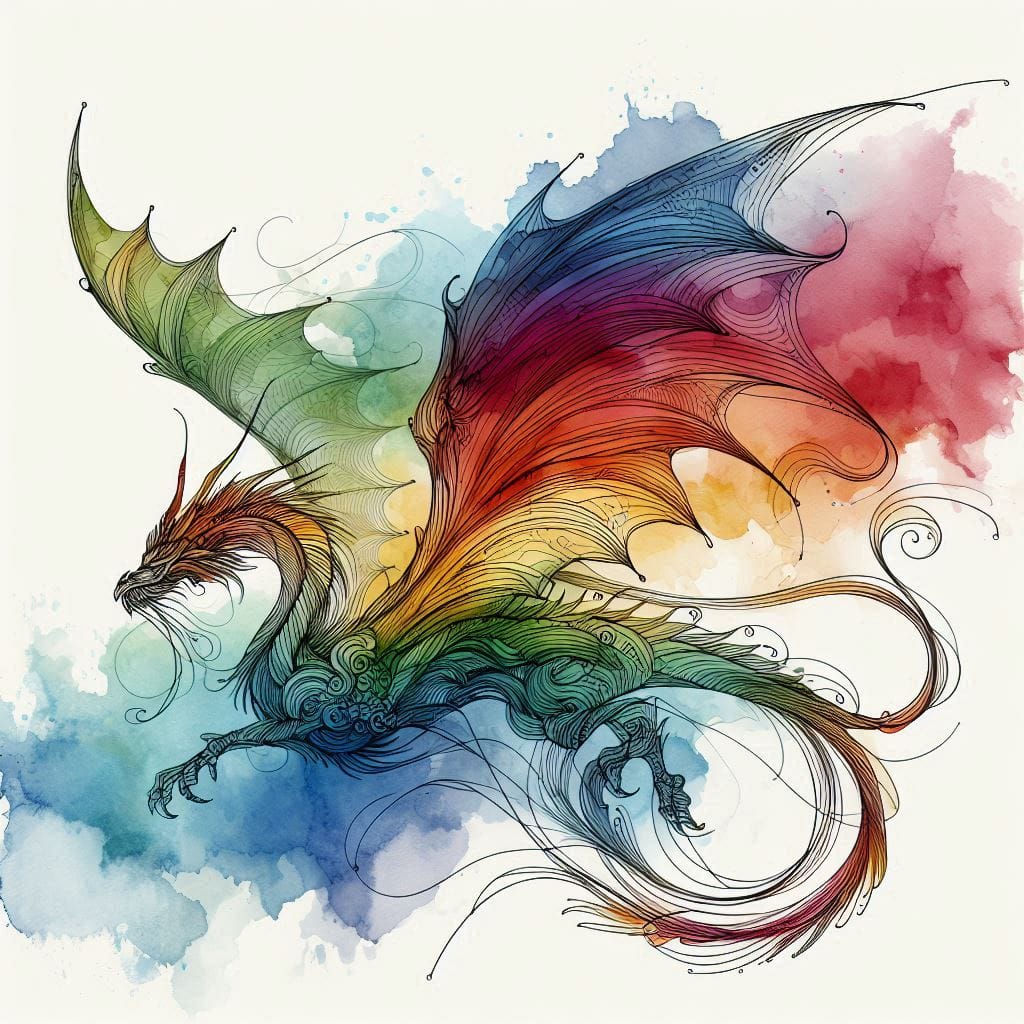 Same Prompt🤔: Create an image of a line drawing of a dragon in flight in the style of a watercolor wash using a hushed rainbow color palette.