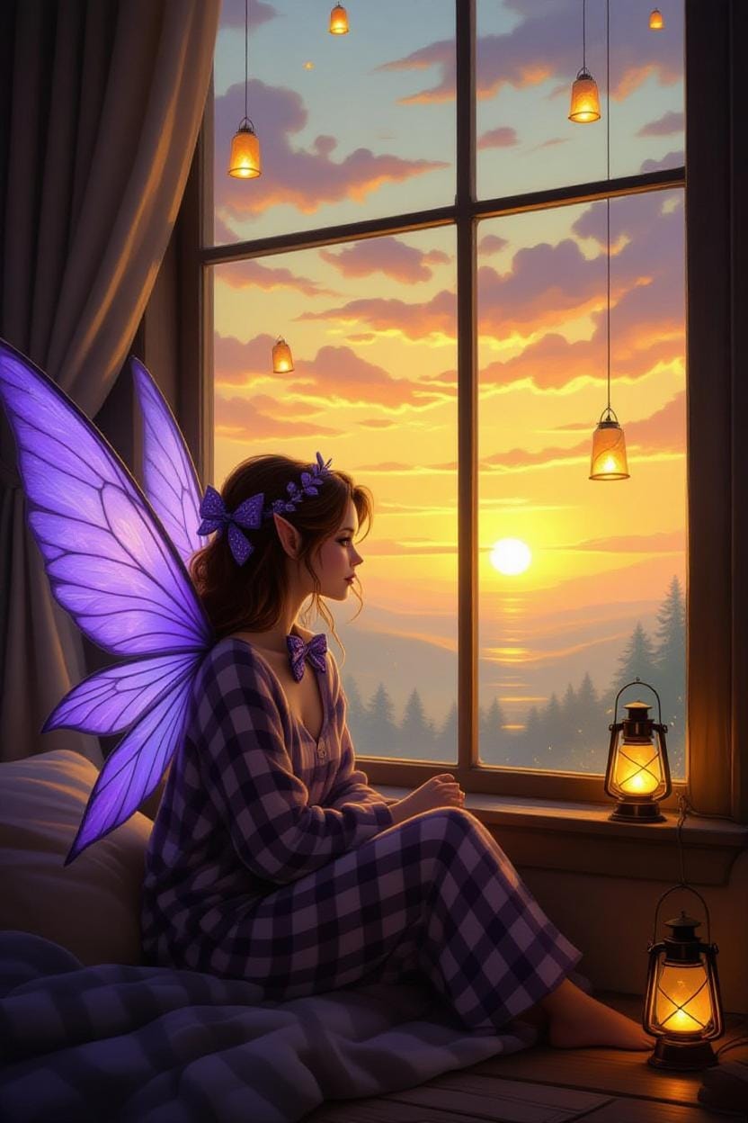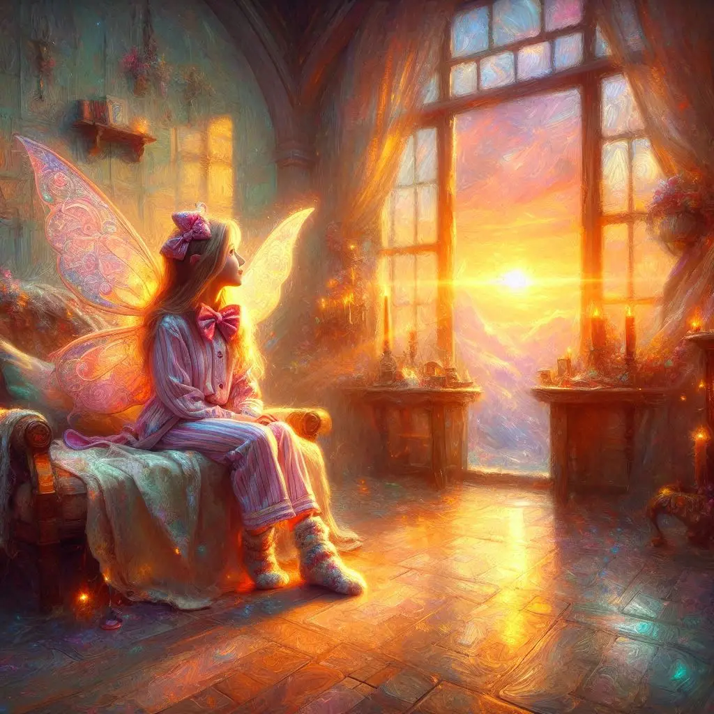 Same Prompt 🤔: Create an image of a faerie wearing pajamas and a bowtie sitting in a quiet room looking out a window at a sunrise in the style of a magical impressionist Dungeons and Dragons painting.