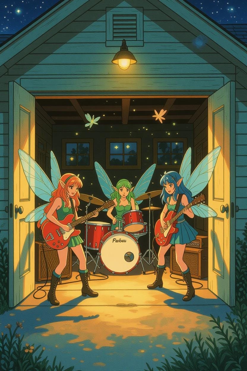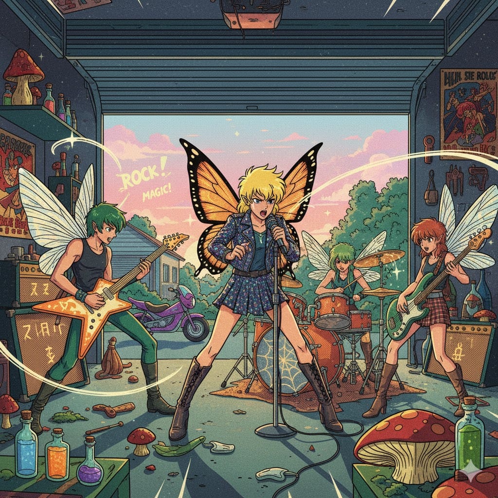 Same Prompt: Create an image of a Rock and Roll band of Faeries playing in a garage with the door open at dawn in the style of a magical pop art vintage anime painting.