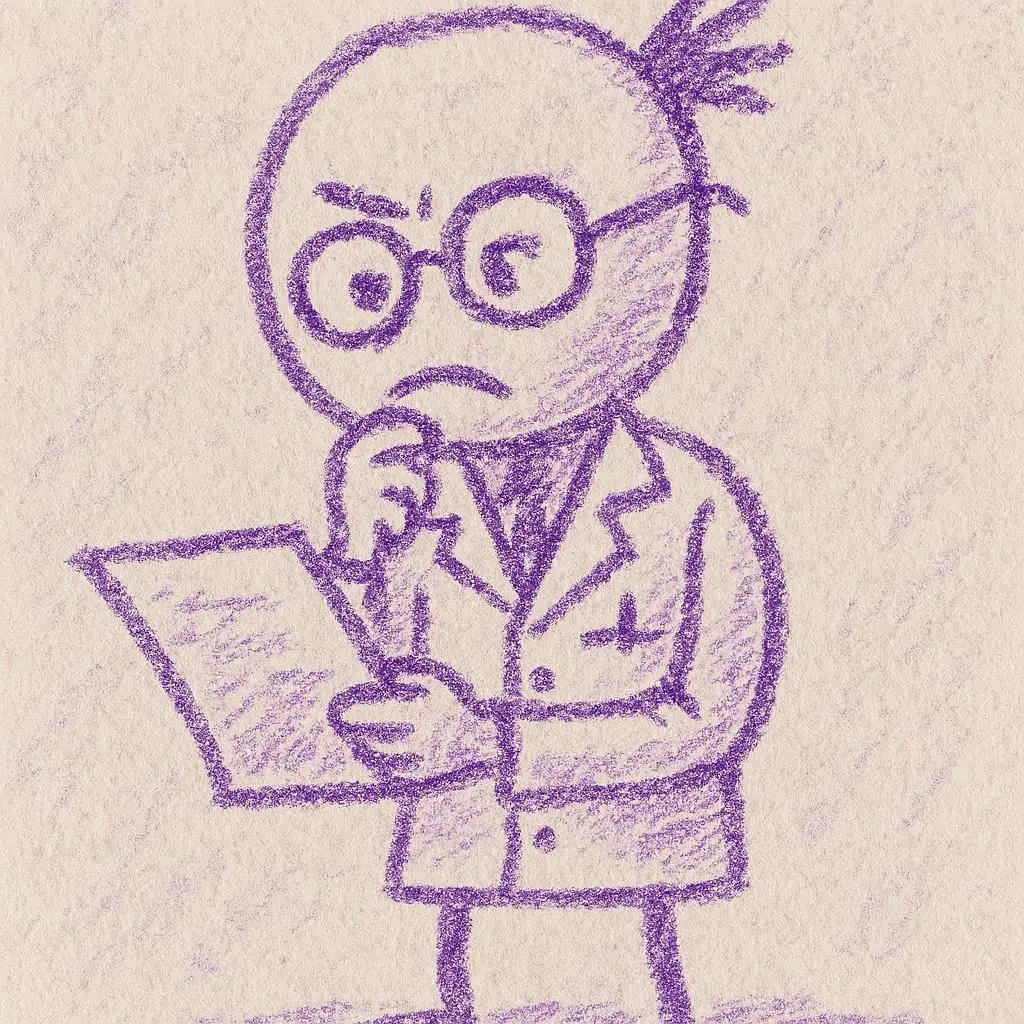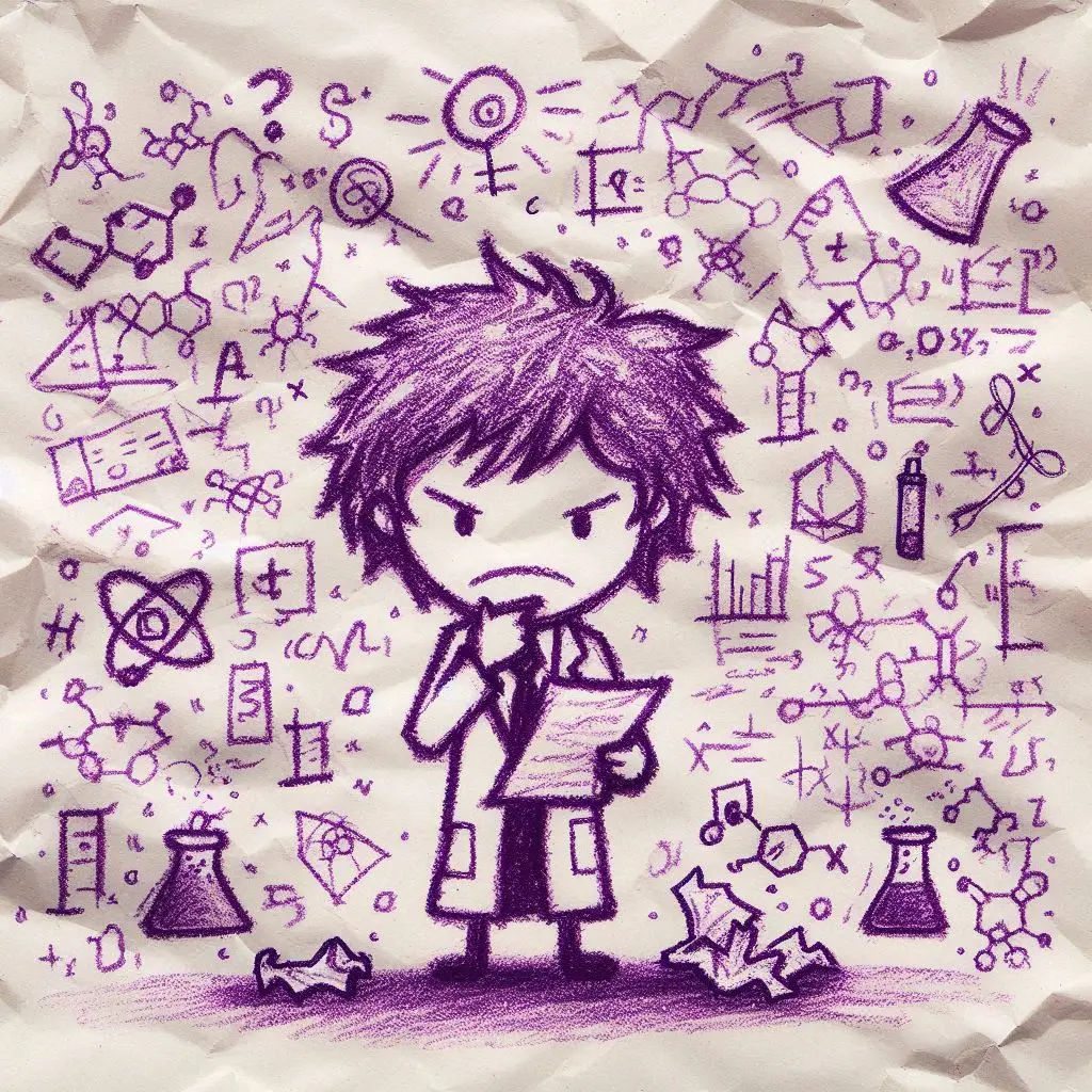 Same Prompt🤔: Create a poorly drawn stick figure image made with a purple crayon of a deep in thought Scientist reading a piece of paper.