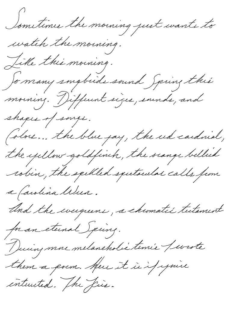 So many songbirds sound Spring this morning. Different sizes, sounds, and shapes of songs.