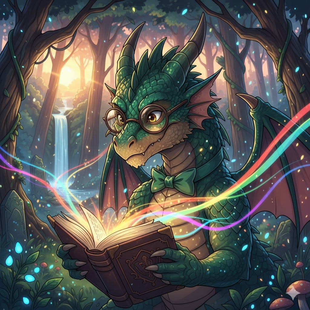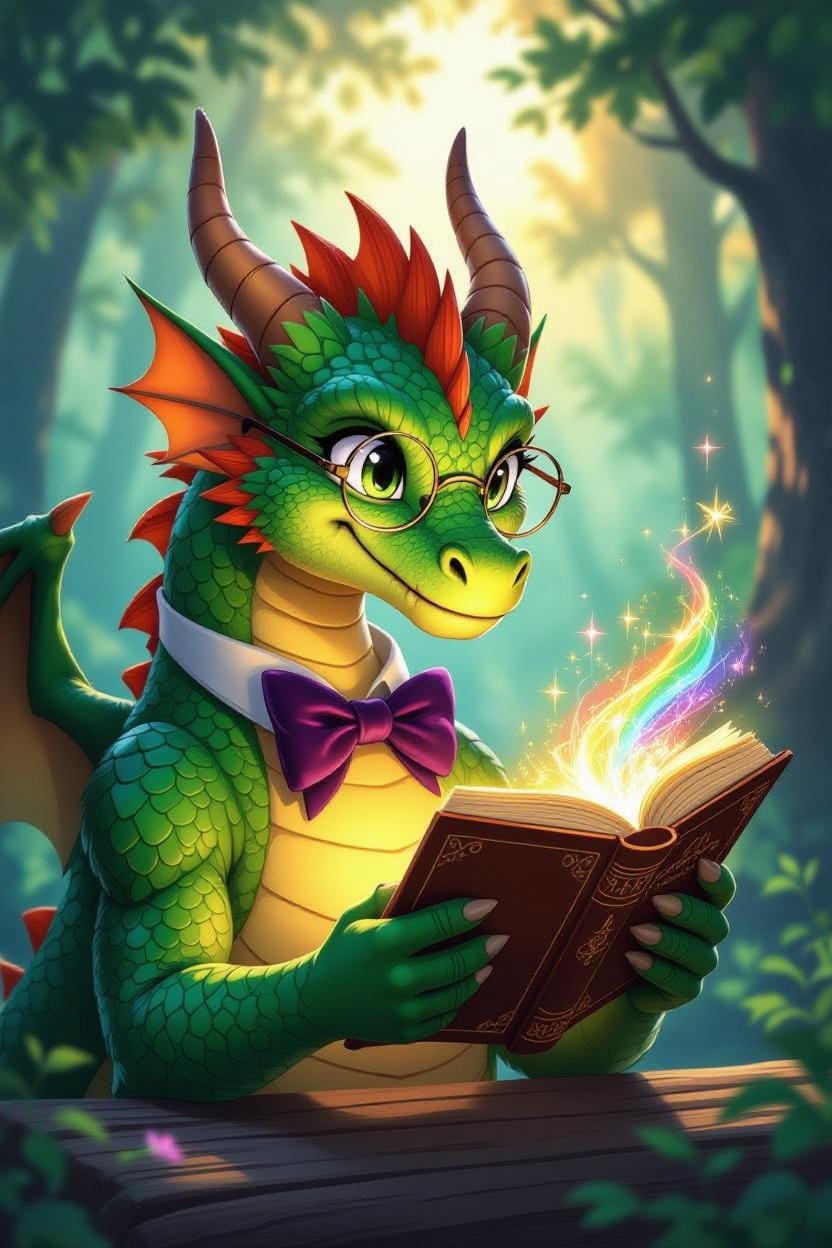 Same Prompt🤔: Create an inspiring image of a nerdy dragon wearing glasses and a bowtie reading an ancient text in an enchanted forest at dawn with rainbow light coming from the book's pages in the style of a magical anime illustration using bright, vivid light and stark shadows.