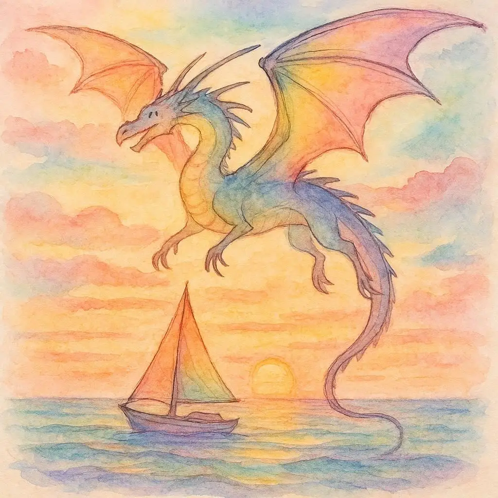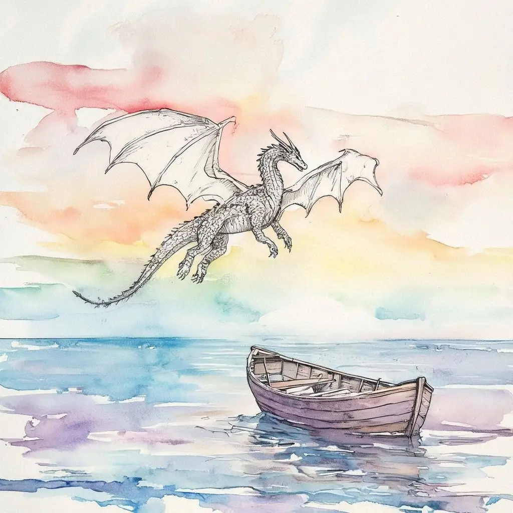 Same Prompt🤔: Create a line drawing of a dragon flying in the sky over a boat in the ocean at dawn in the style of a watercolor wash using a rainbow color palette.