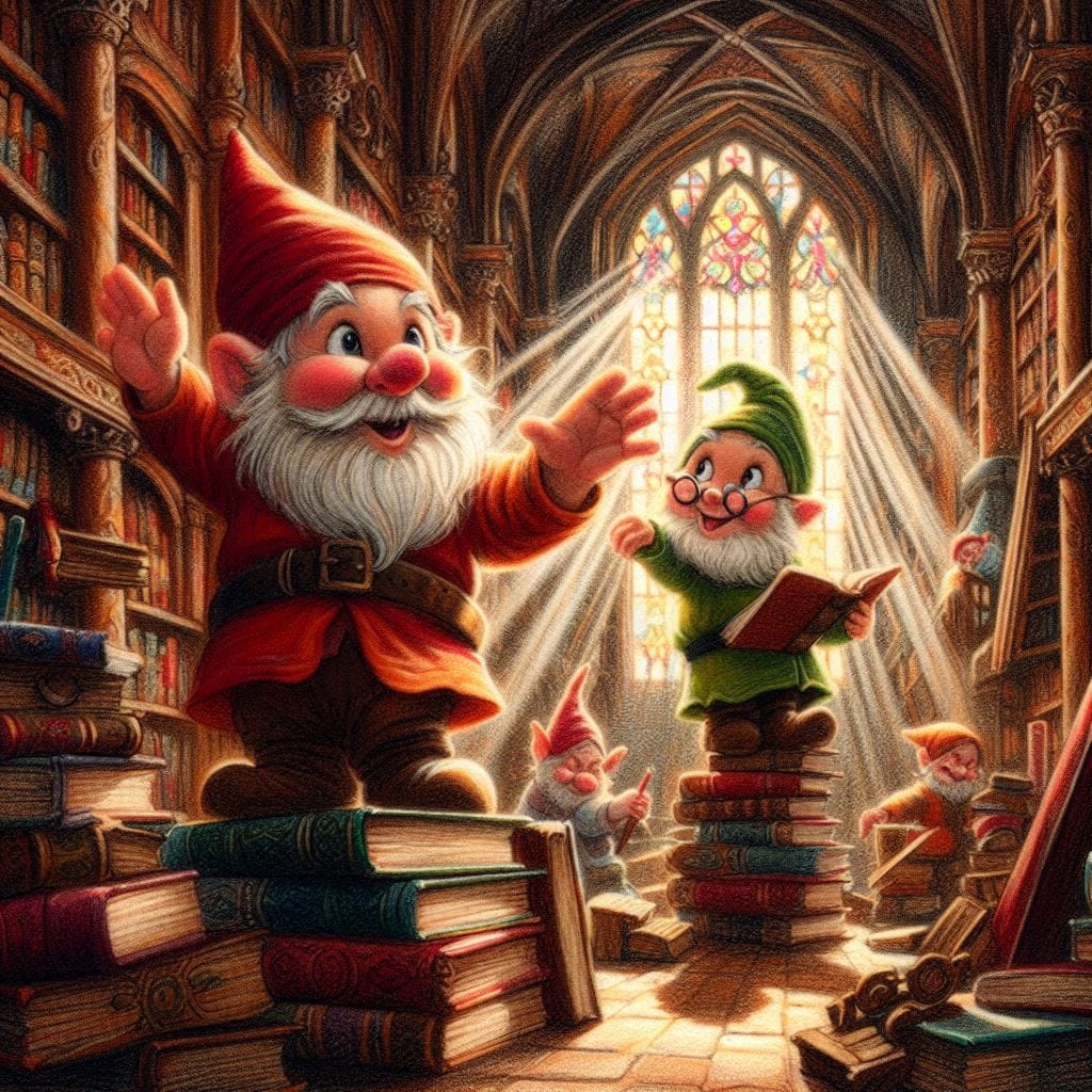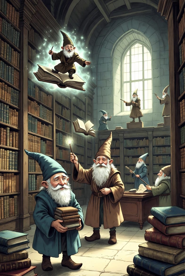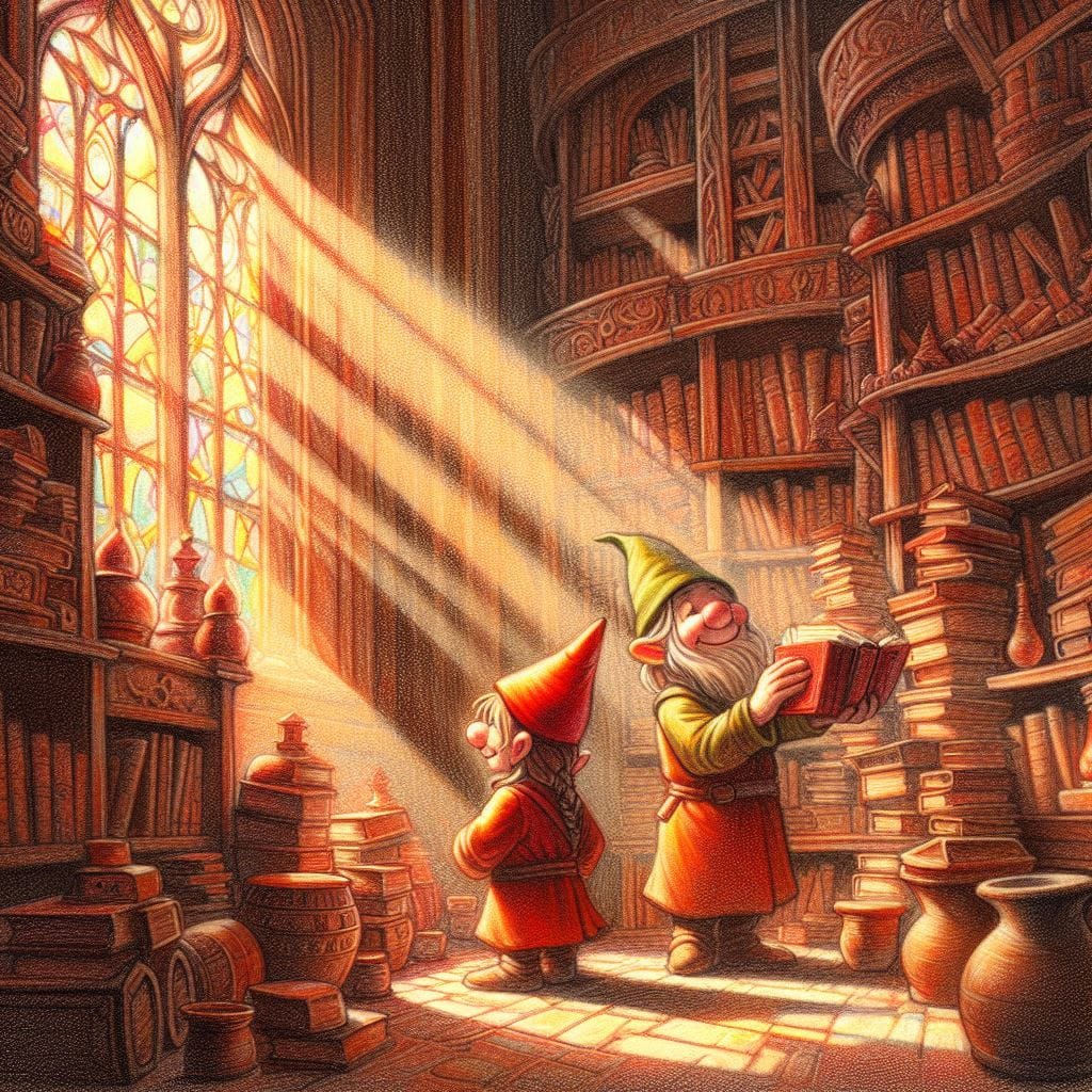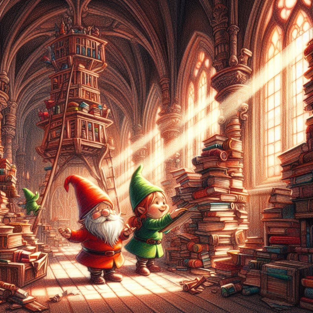 Same Prompt🤔: Create an image of a couple gnome redecorating an ancient library in the style of a magical cross-hatching color pencil illustration using warm tones and stark shadows.