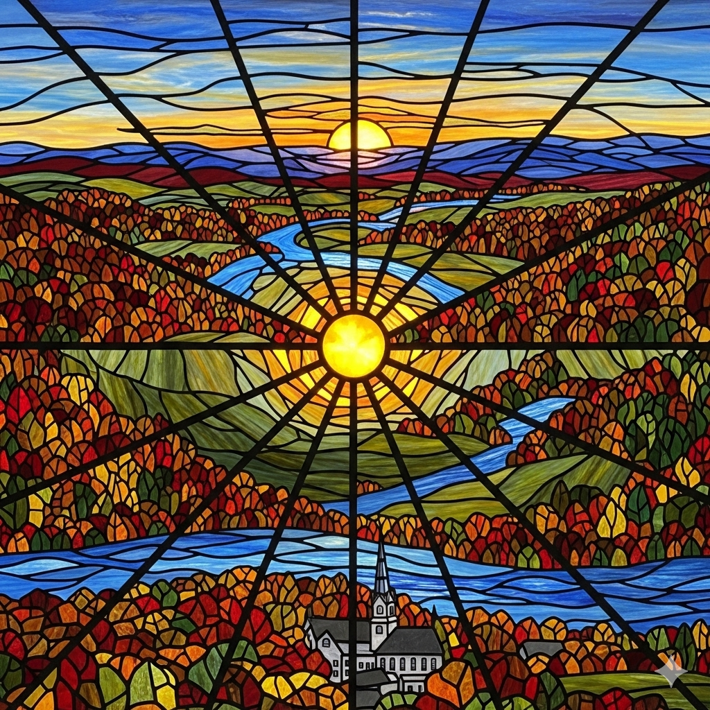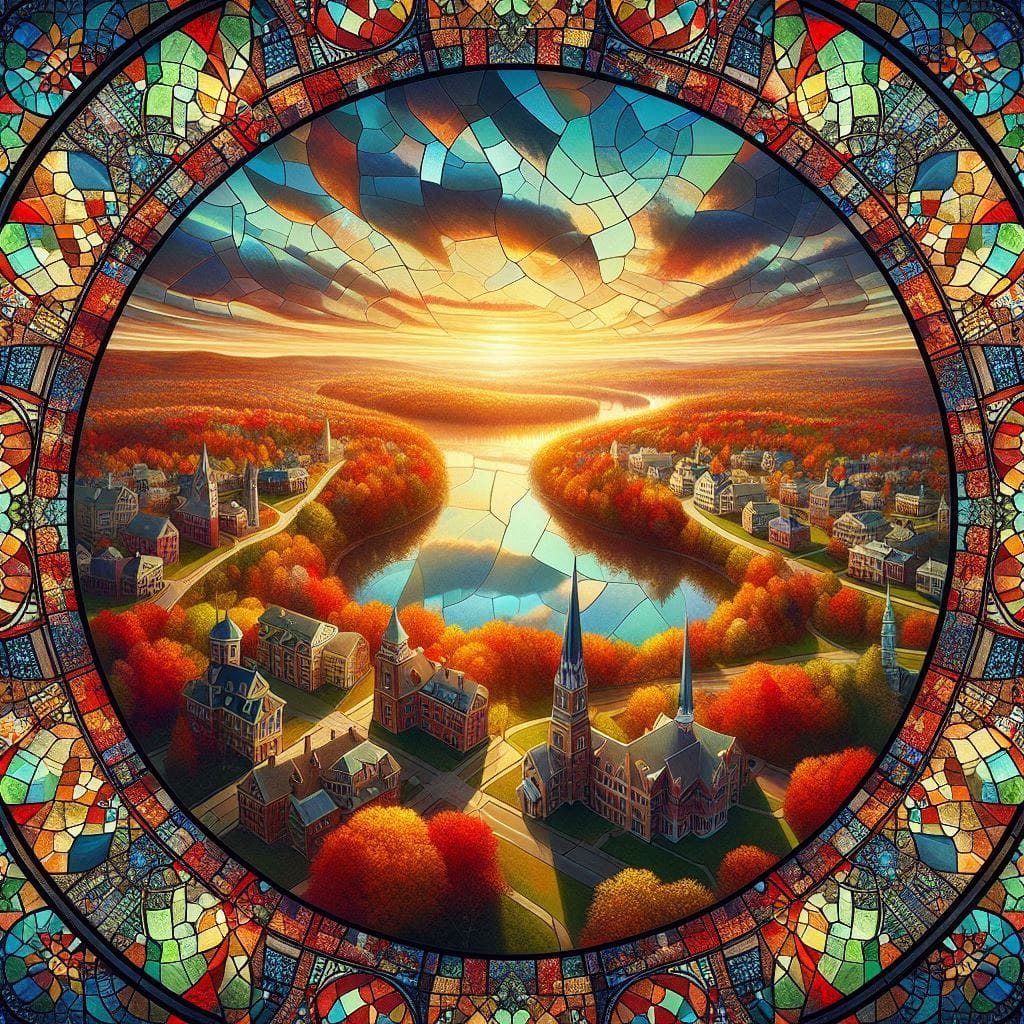 Promptly Spoke: Create an image of a bird's eye view of an Autumn New England landscape looking through a kaleidoscope at dawn in the style of a stained-glass window.