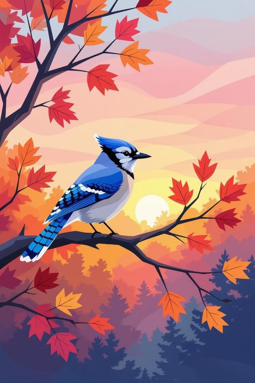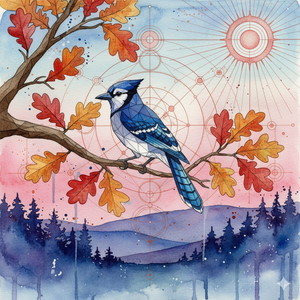 Same Prompt: Create an image of a blue jay on the branch of an oak tree covered with colorful Autumn foliage at dawn in New England with a pink, blue sky in the style of a magical abstract watercolor wash using geometric art themes.