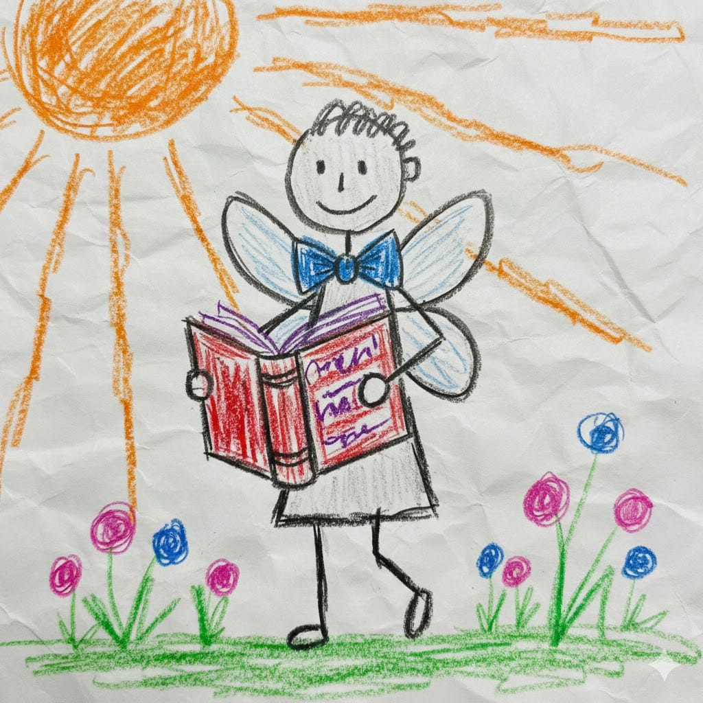Same Prompt🤔: Create a poorly drawn stick figure illustration drawn with crayons of a faerie wearing a bowtie writing in a book at dawn.