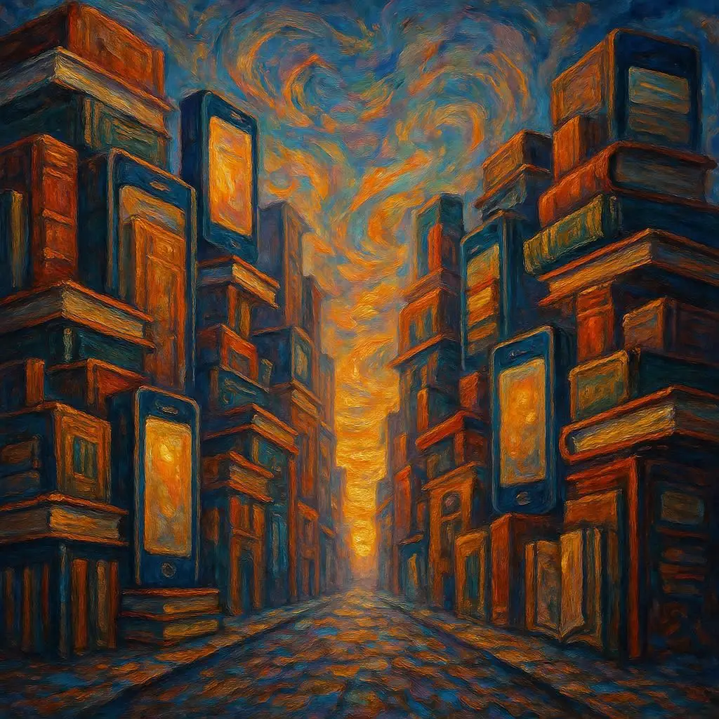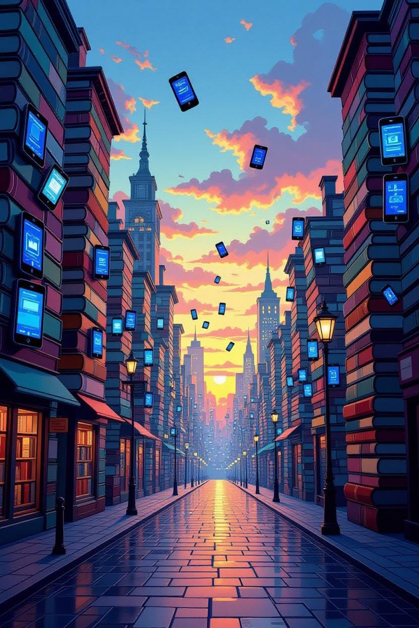 Same Prompt: Create an image of a city street at dawn with buildings made of books and cellphones in the style of a magical abstract surrealist painting.