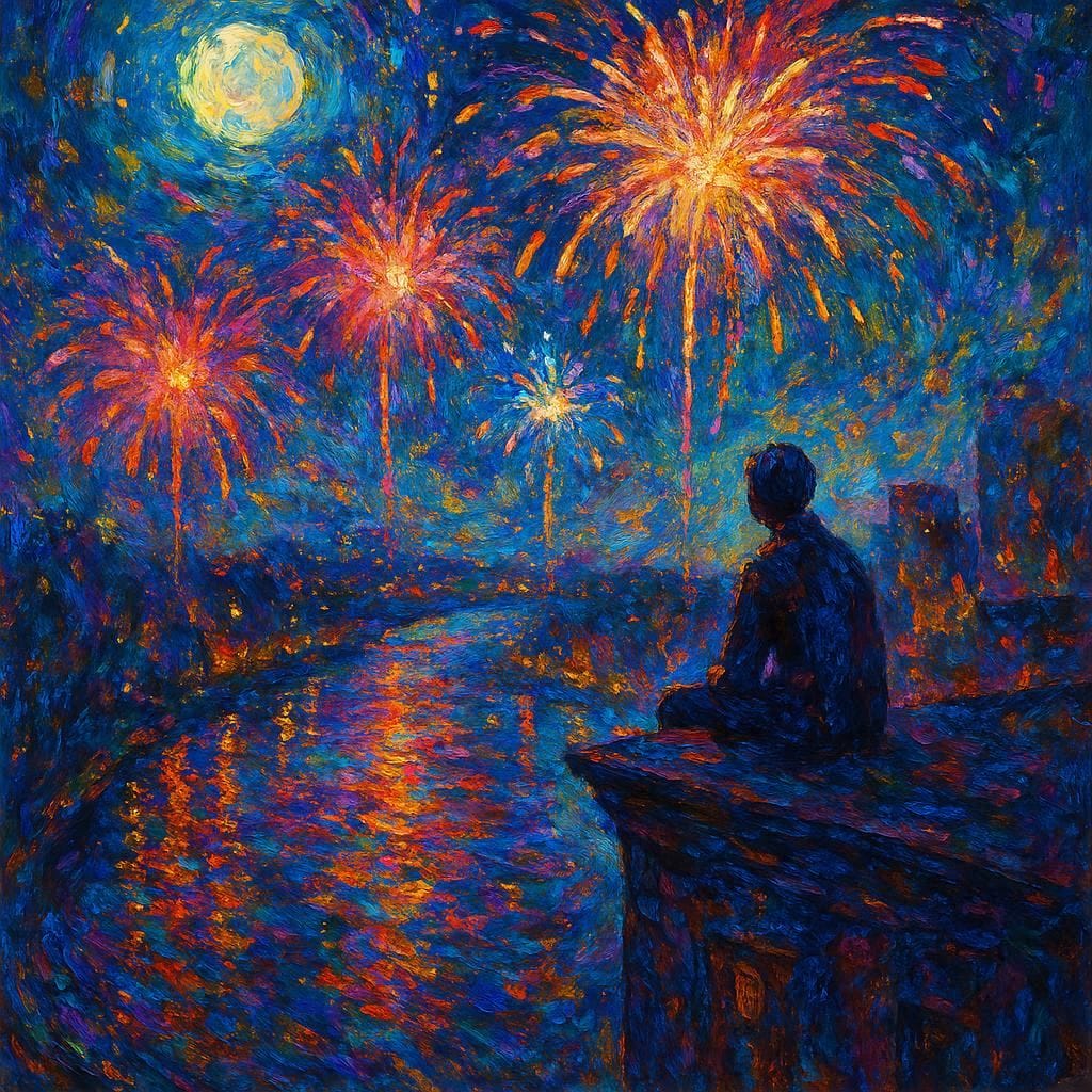 Only a spark for so long where a firework lightshow used to be.