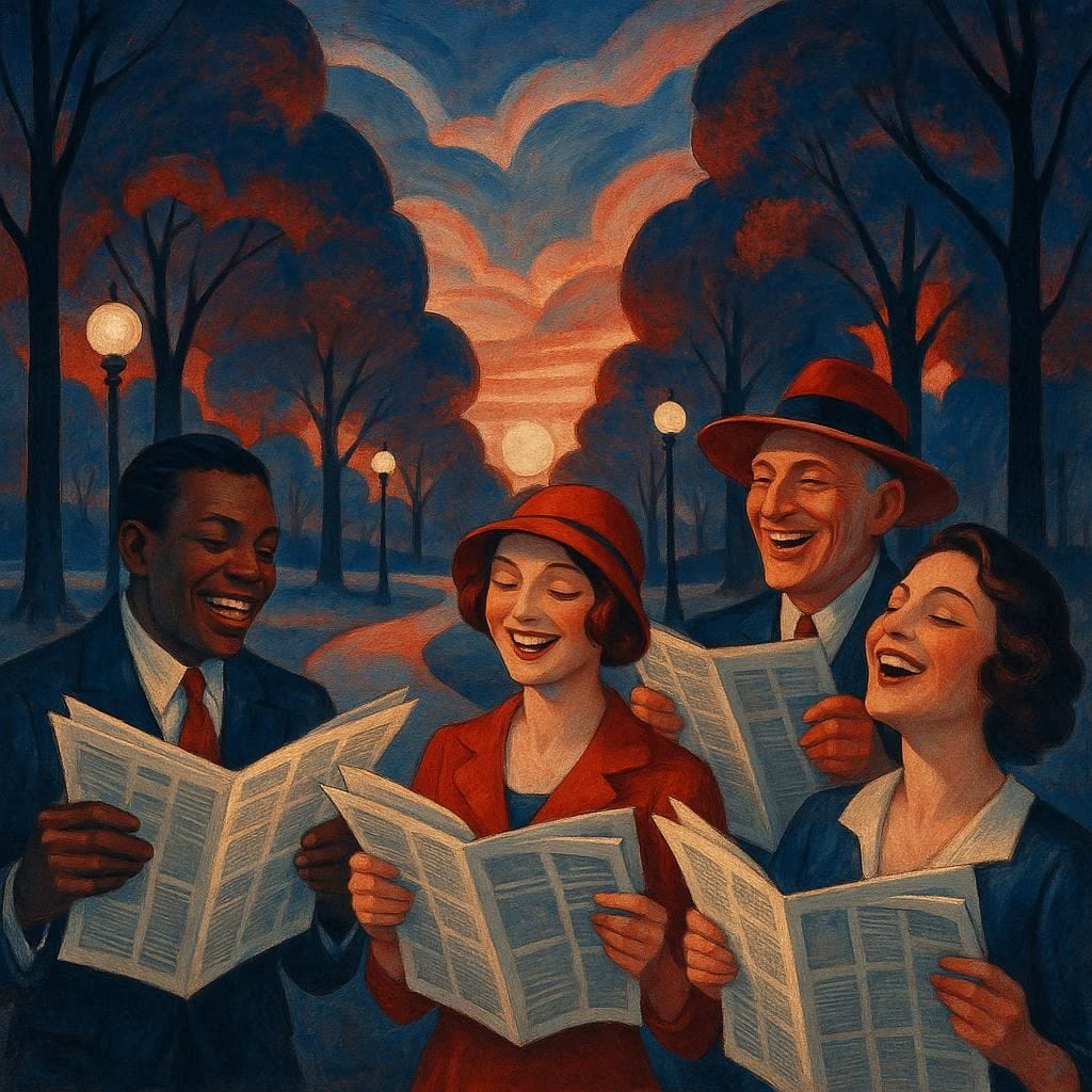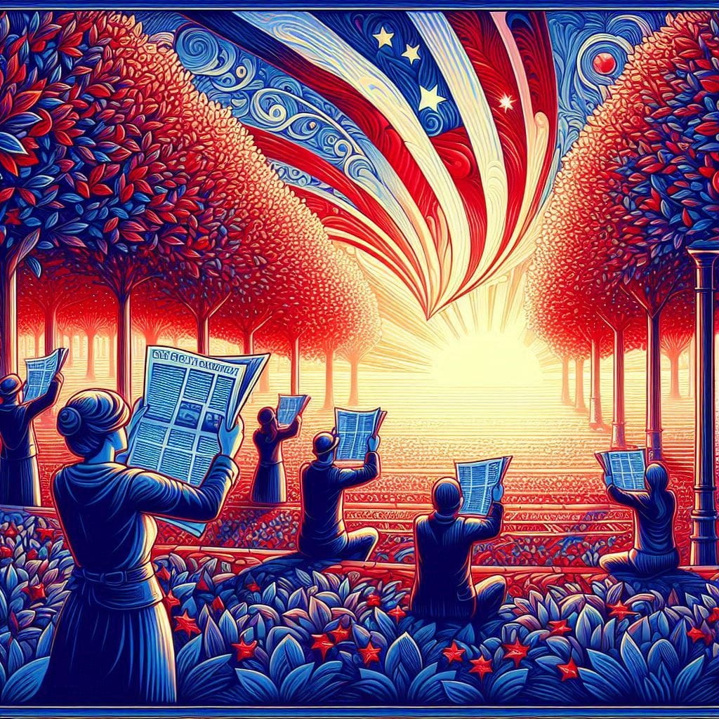 Same Prompt: Create a joyful image of people holding newspapers in a park at dawn in the style of a magical Art Deco Realist painting using a red white and blue color palette.