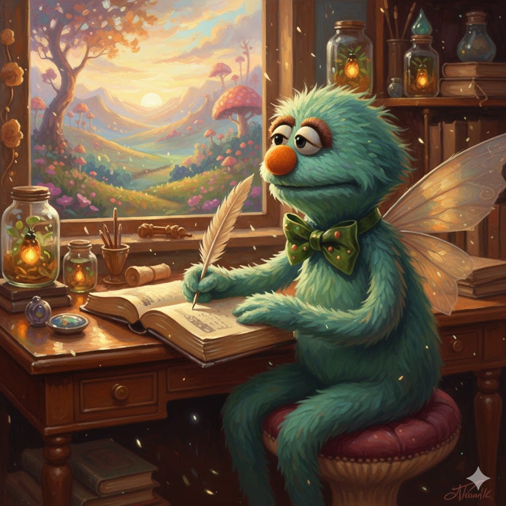 Same Prompt🤔: Create an image of a Muppet faerie wearing a bowtie sitting at a desk by a window writing at sunrise in the style of a magical Impressionist painting.