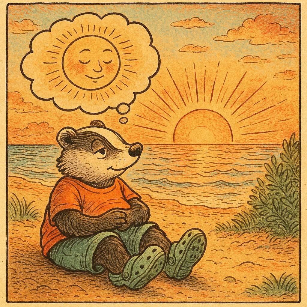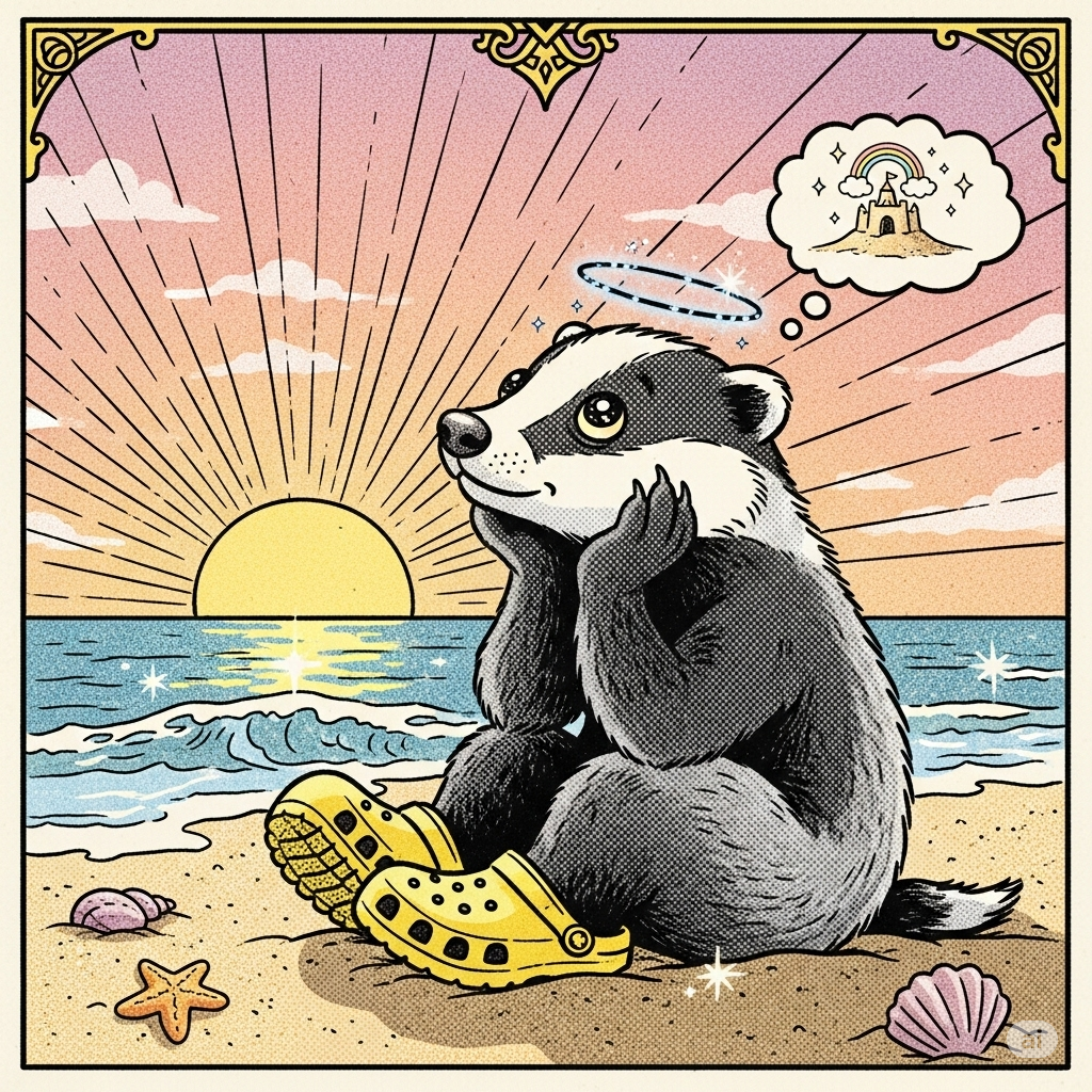 Promptly Spoke: Create an image of a badger daydreaming while sitting on the beach wearing Crocs during a sunrise in summer in the style of a magical vintage comic strip illustration.