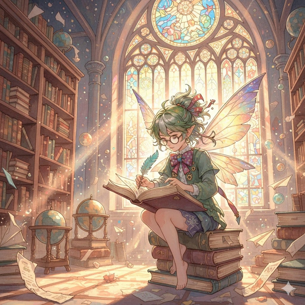 Same Prompt🤔: Create a dreamy image of a nerdy faerie wearing a bowtie sat in an ancient library writing while the sun rises through a large cathedral sized window in the style of a magical impressionist anime painting.