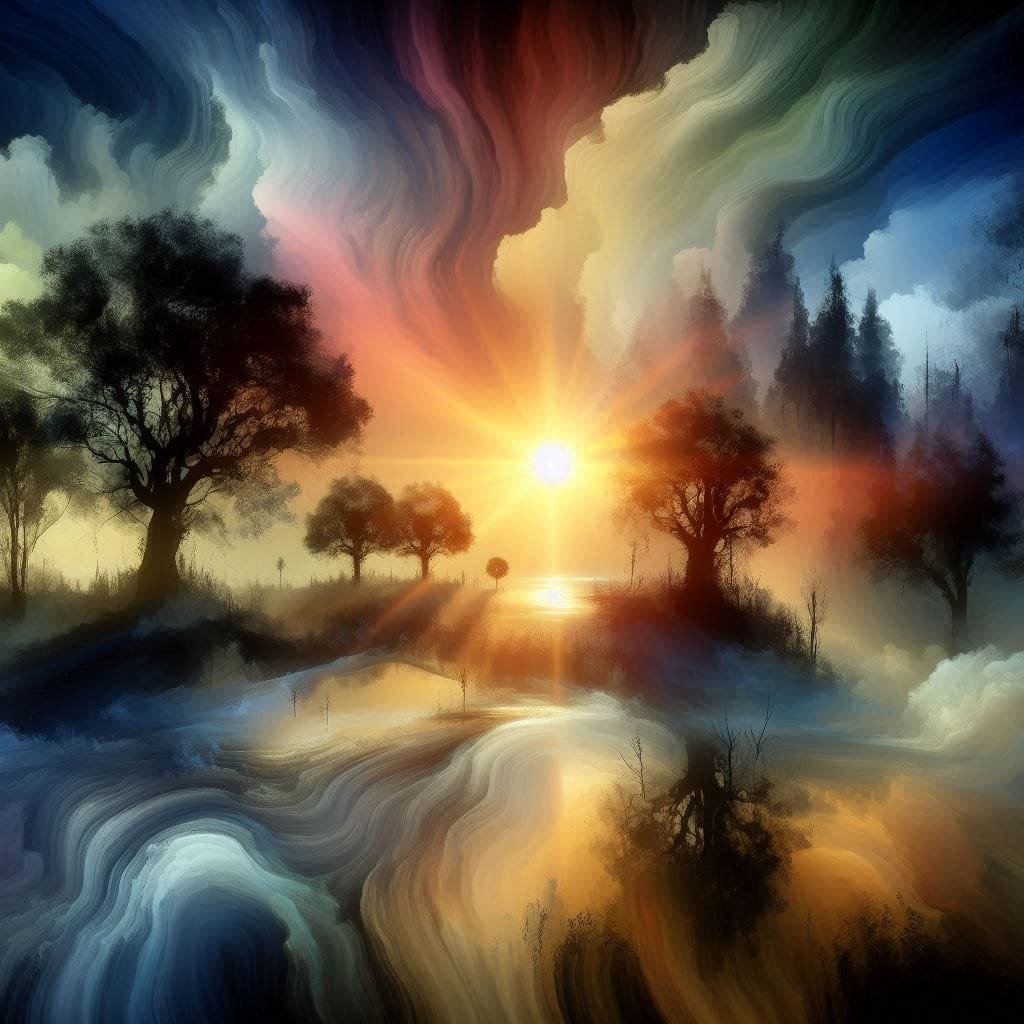 Promptly Spoke: Create an image of a sunrise over an enchanted forest in the style of a magical abstract realism painting using stark shadows and soft light.