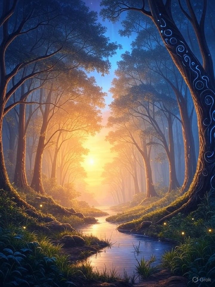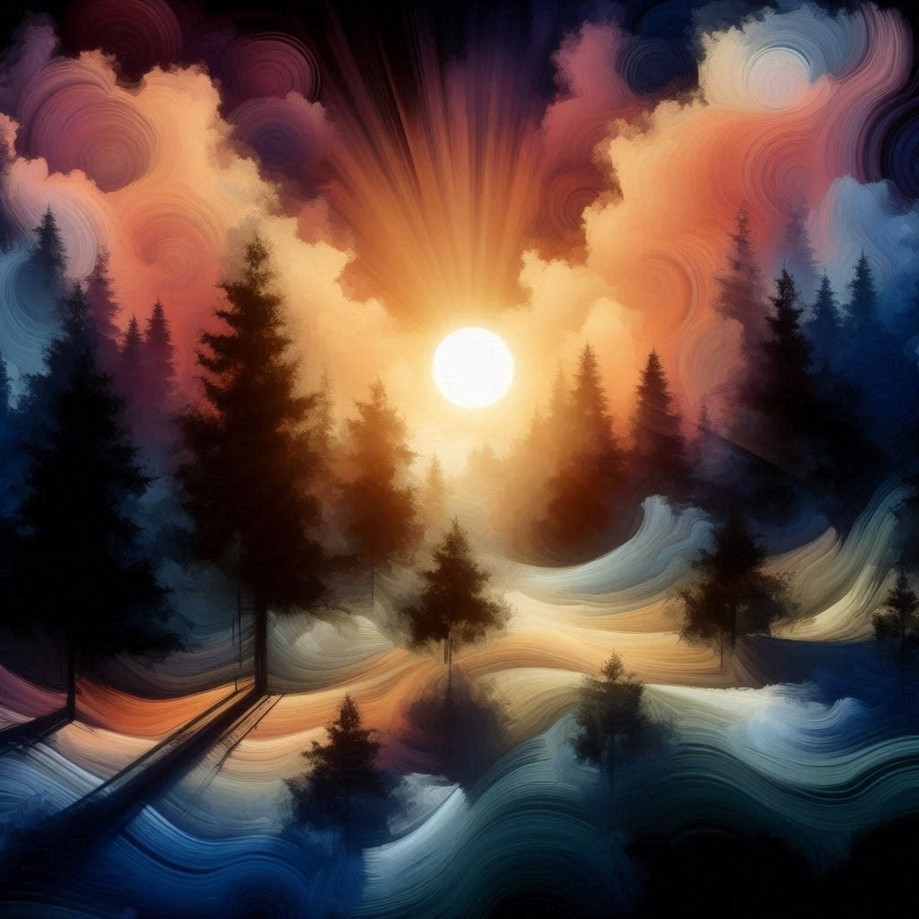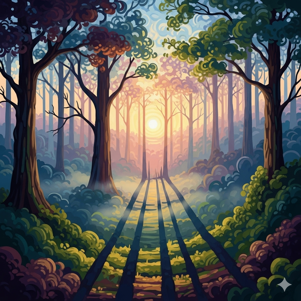 Promptly Spoke: Create an image of a sunrise over an enchanted forest in the style of a magical abstract realism painting using stark shadows and soft light.
