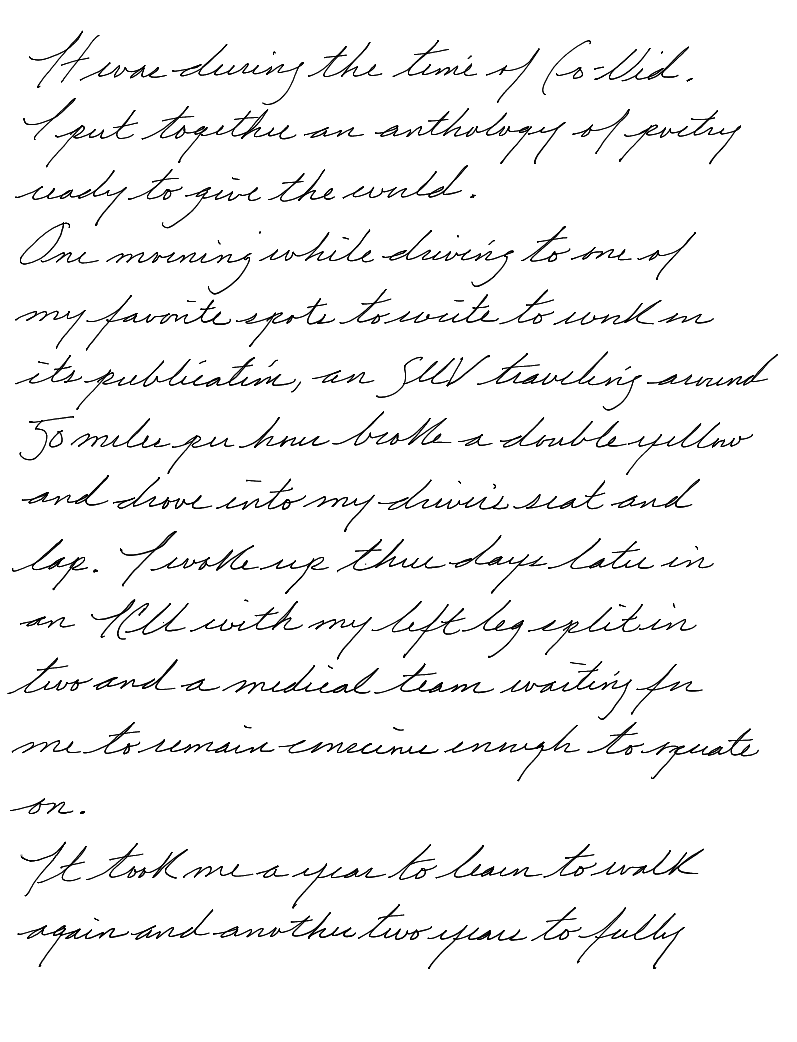 One morning while driving to one of my favorite spots to write and work on its publication, an SUV travelling over 50 miles per hour broke a double yellow and drove into my driver's seat and lap.