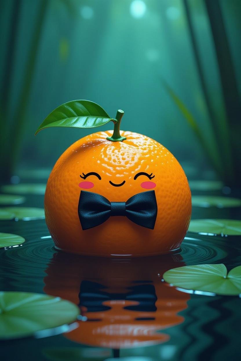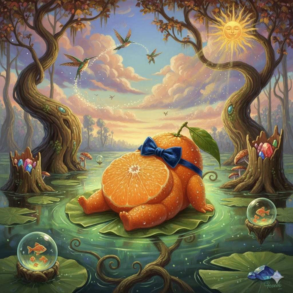 Same Prompt: Create an image of an orange wearing a bowtie sunbathing in a swamp in the style of a Magical Surrealist painting.