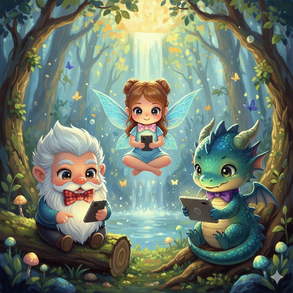 Same Prompt: Create an inspiring image of a gnome, a faerie and a dragon all wearing bowties, looking at their cellphones while sitting in an enchanted forest in the style of a chibi anime impressionist painting.