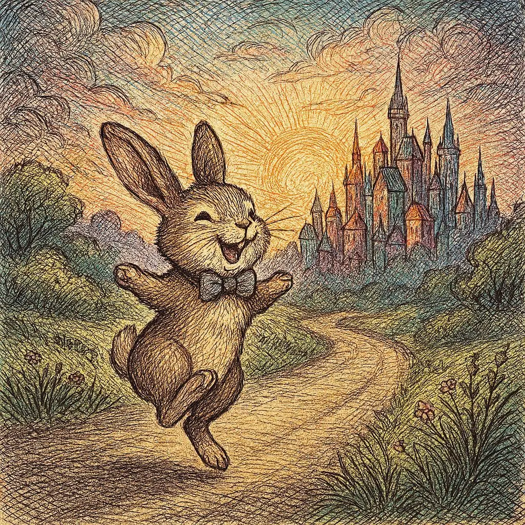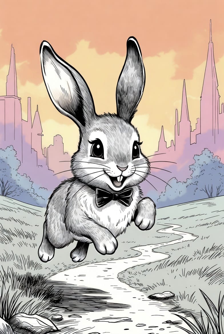 Same Prompt🤔: Create a joyful image of a rabbit wearing a bowtie hopping down a path towards a colorful cityscape at dawn in the style of a magical cross-hatching pen and ink illustration.