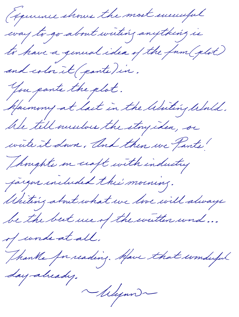 Decades of experience shows the most successful way to go about writing anything is to have a general idea of the form (plot) and color it in (pants).