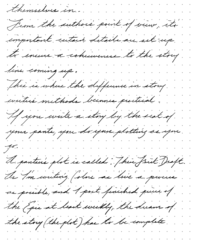 As I'm writing Colore as 'live' a process as possible, and I post finished pieces of The Epic at least weekly, the dream of the story (the plot) has to be complete in my mind. There's no turning back once posted to edit.
