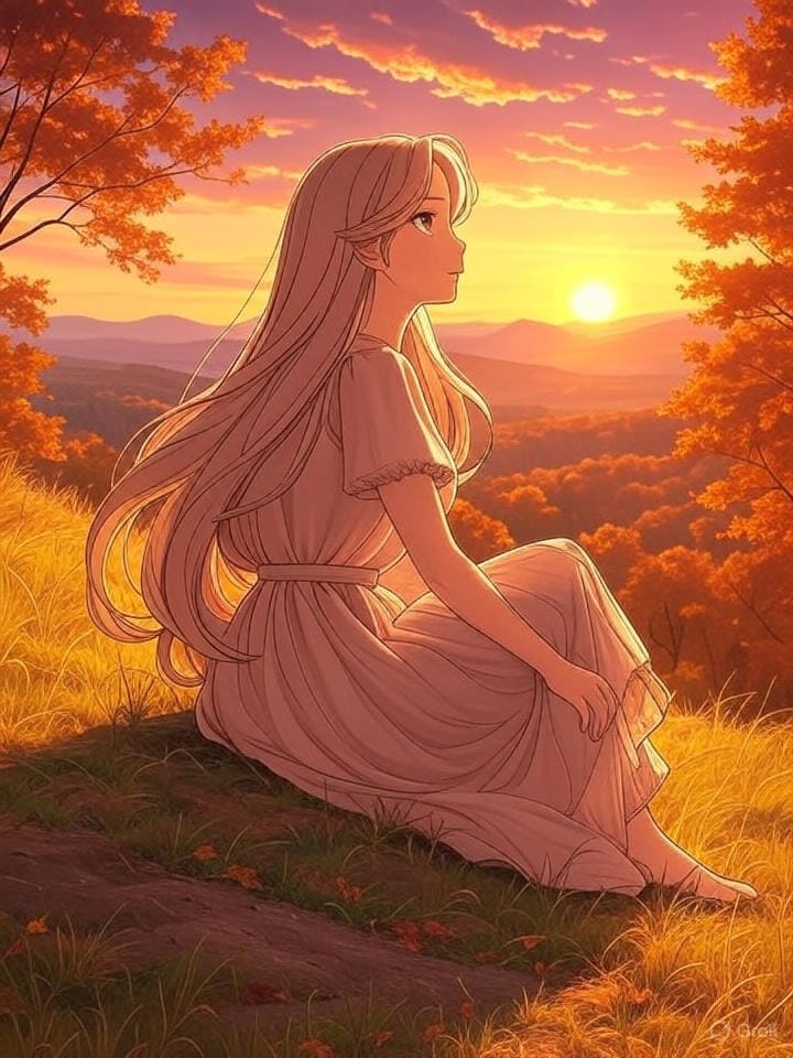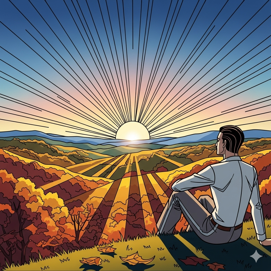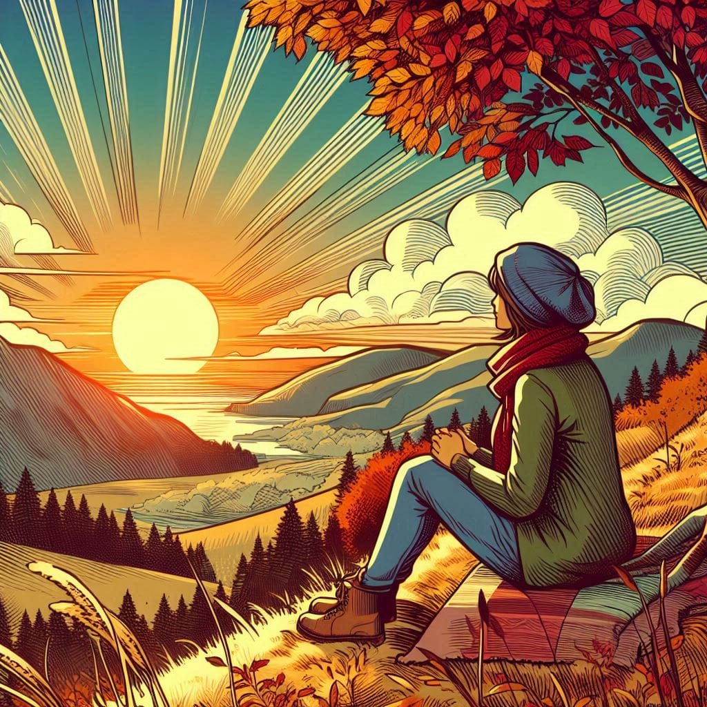 Promptly Spoke: Create an image of a person sitting on a hillside daydreaming while watching the sunrise in New England in Autumn in the style of an Art Deco Anime Drawing.