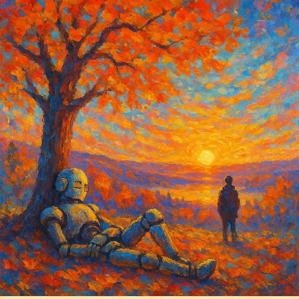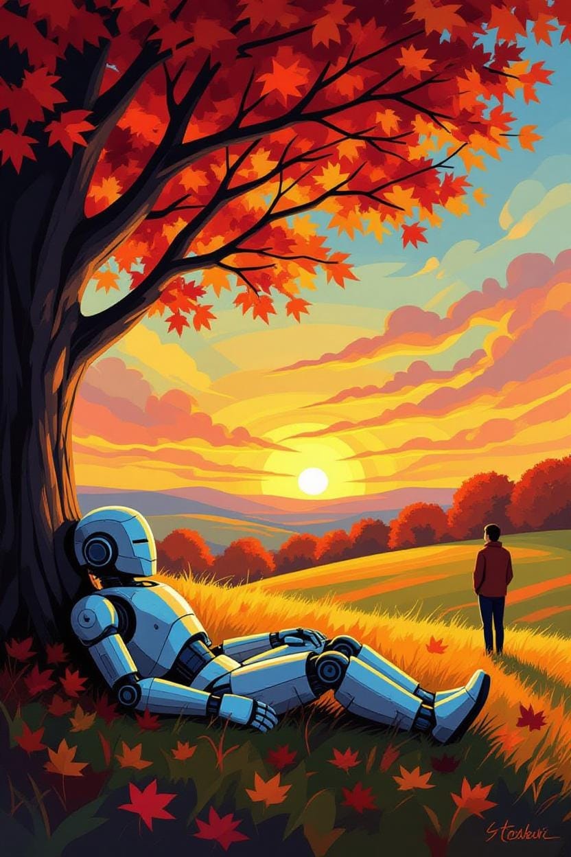 Same Prompt: Create an image of a robot sleeping under an oak tree while a person watches a sunrise in New England in the Autumn in the style of a magical abstract impressionist painting using a bright hopeful color palette.
